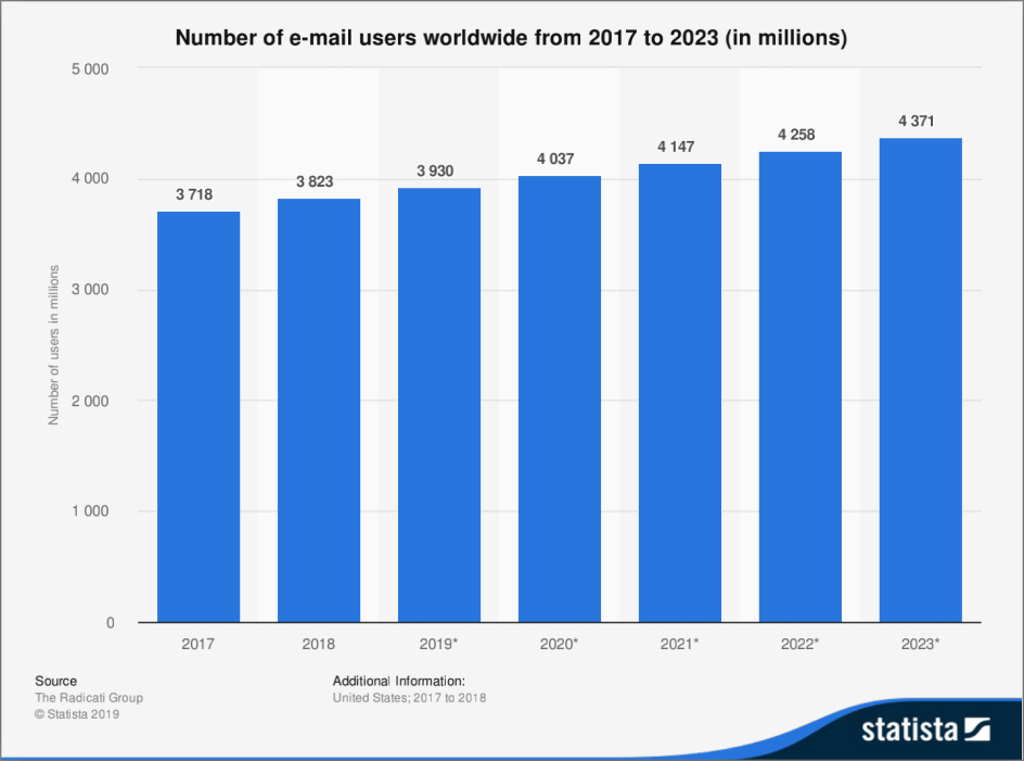Email has a large number of active users. According to the report of Statista(Clement, 2019), email users worldwide have reached 3.9 billion in 2019, and this number is expected to increase to more than 4.3 billion in 2023. What a surprising number, email actually plays an important role in our online life. When we first went online using Google Chrome, we needed to enter an email address to create an account. We even need an email address to create a social media (like Facebook) account. The widespread use of email makes it an important marketing tool for marketers to reach customers.