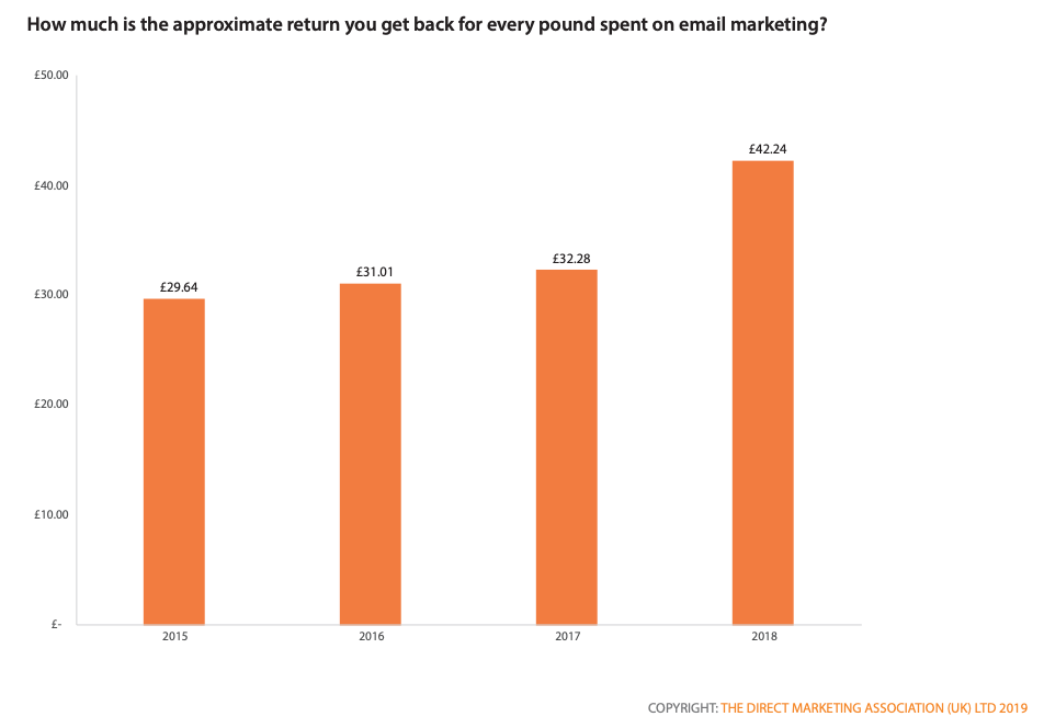 According to the Marketer email tracker 2019 report, email marketing has a return on investment (ROI) of £ 42.24 for every £ 1 spent in 2018.